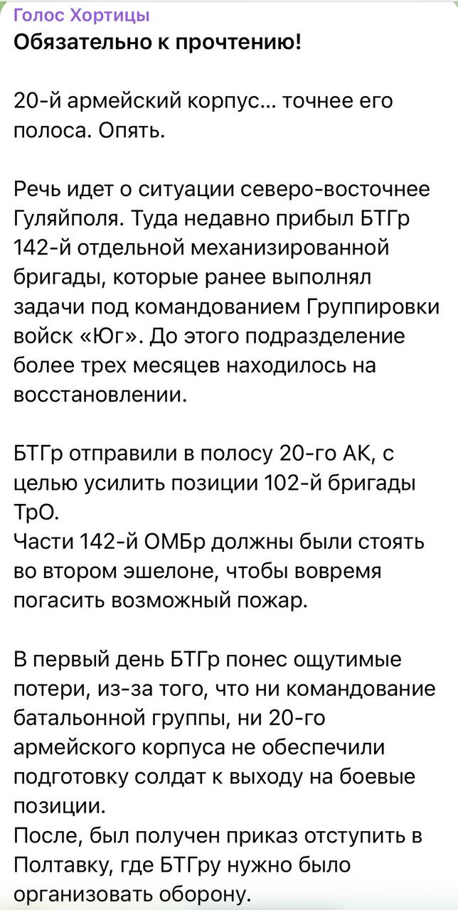 Противник сообщает о серьезных ошибках (перетасовывают пидроздилы, внося хаос в оборону) командования ВСУ на участке Успеновка-Полтавка Запорожской области, где наступает ГрВ «Восток». Итог ошибок офмцера по фамилии Бибик - прорыв наших