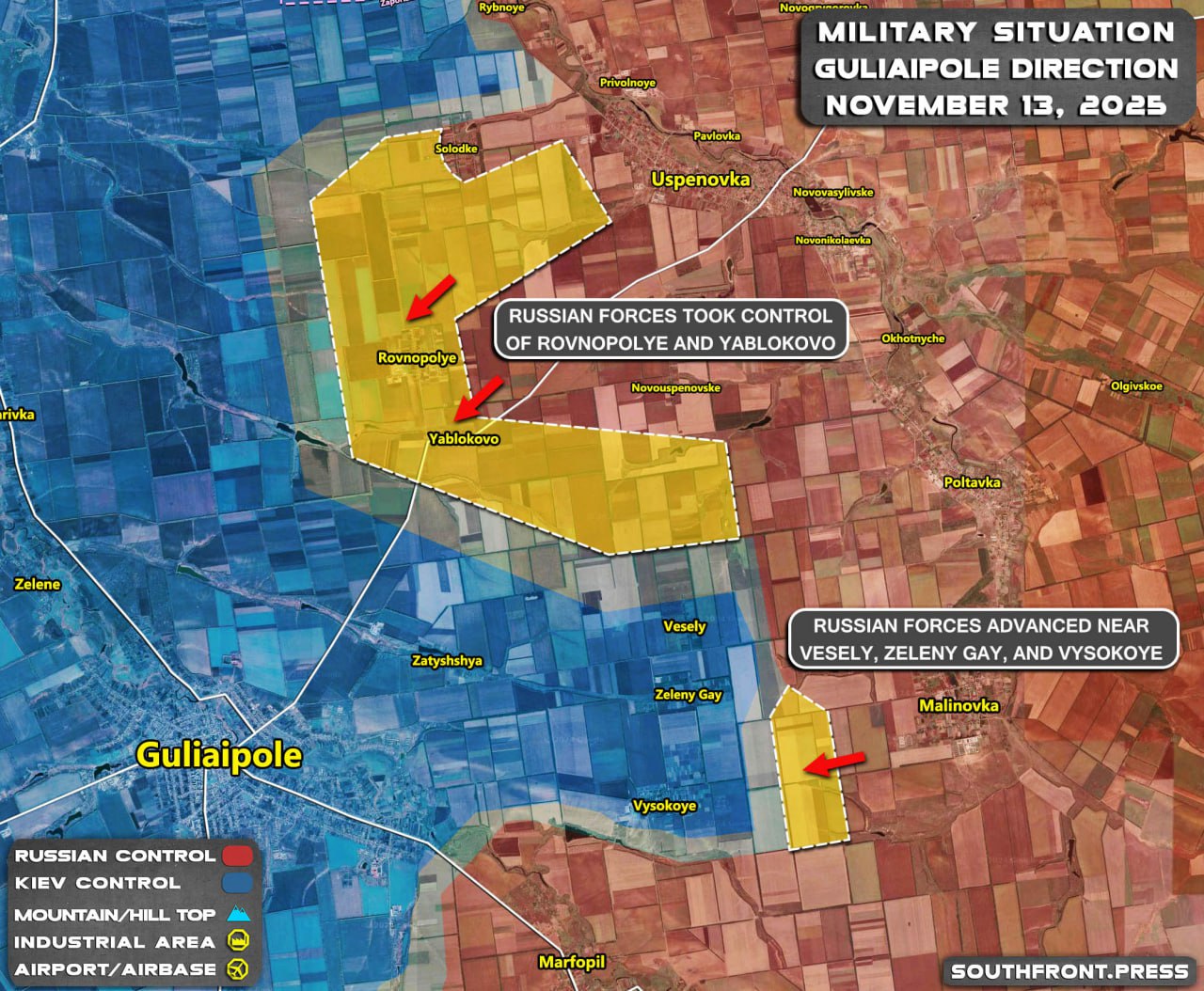 Наступление российских войск продолжается на Северском, Покровском, Купянском, Днепропетровском и Запорожском направлениях. В ходе боевых действий установлен контроль над населёнными пунктами Синельниково, Ровнополье, Яблоково и Даниловка. Отмечено продвижение на Константиновском направлении, в районе населённых пунктов Весёлый, Зелёный Гай и Высокое, а также на северной окраине Иванополья.