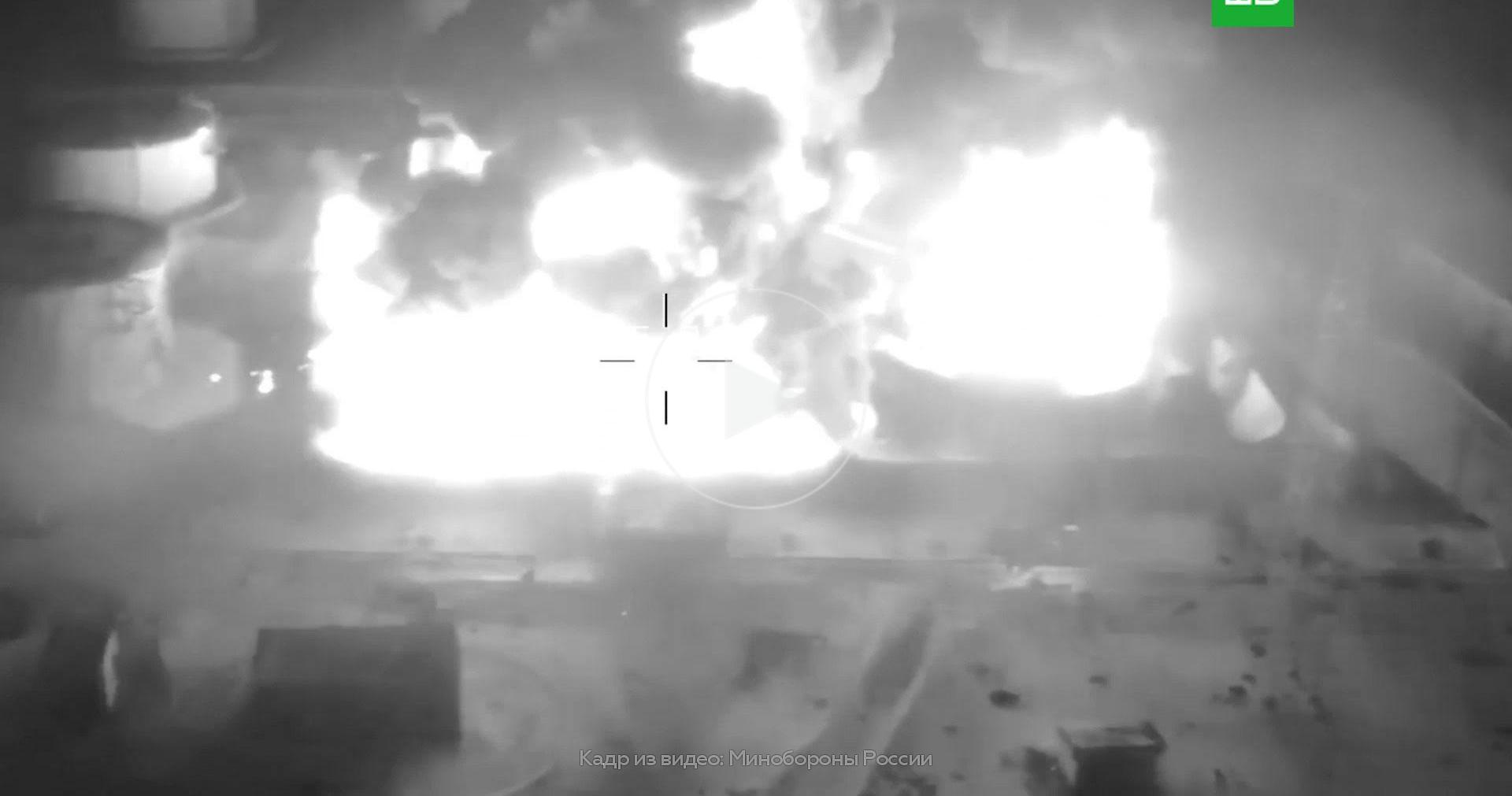 На опубликованных ведомством кадрах видно, как после удара «Гераней» хранилище вспыхивает и взрывается.