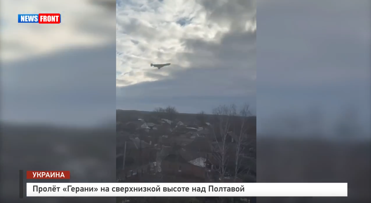 Житель Миргорода снял пролет над своим домом русского БПЛА «Герань?2». Большой треугольный беспилотник с характерным «мопедным» звуком прошел низко над городом, на фоне верхушек деревьев и крыш пятиэтажных домов.