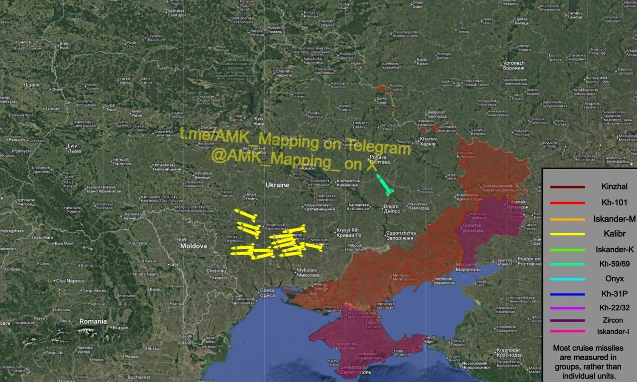 К целям на Украине также приближаются ракеты типа "Калибр", а в сторону Полтавы летят ракеты Х-59